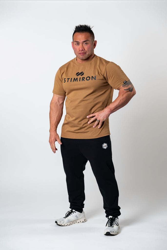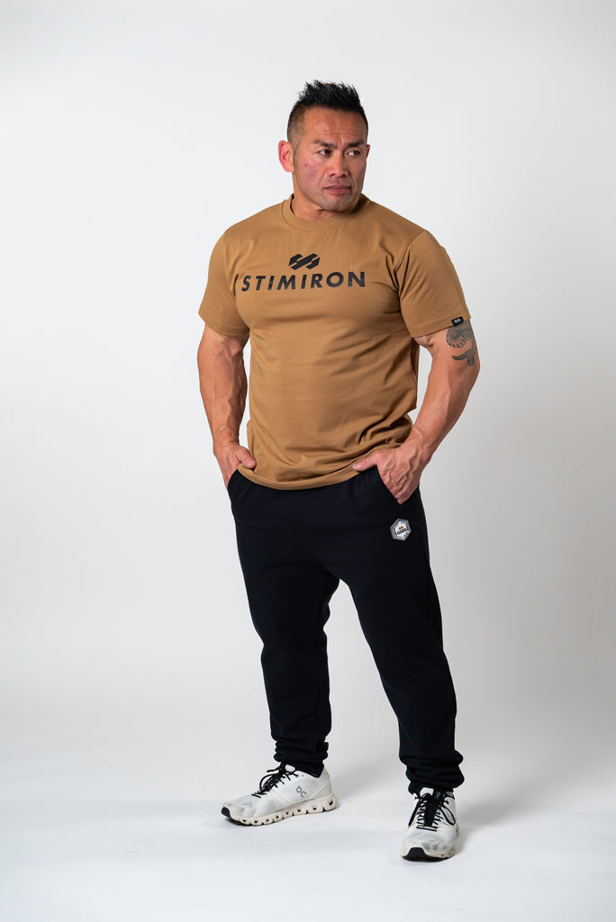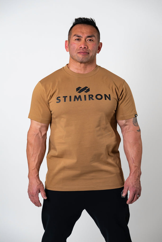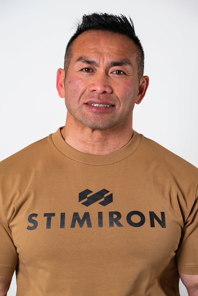 STIMIRONのベーシックスタイル。綿100%でもストレッチ性があり、心地よいフィット感がある。自宅とジムの往復でも着られるタウンユース要素あり。多色展開でオリジナル性が出せるのも魅力の一つ。
