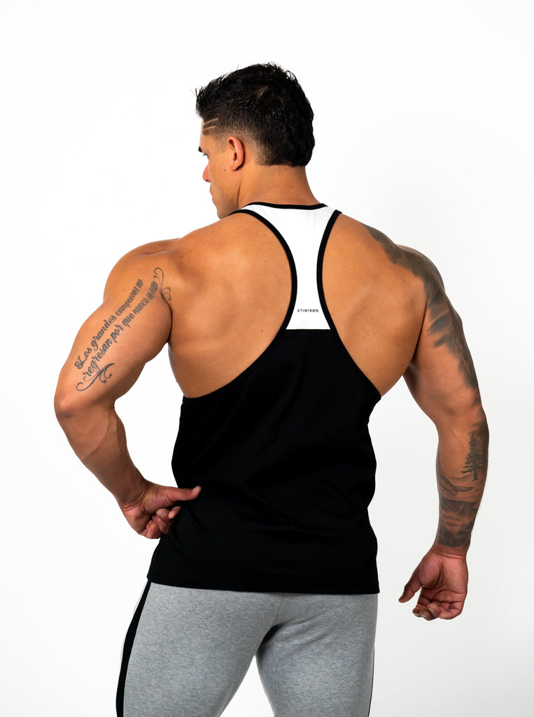 このストリンガータイプのタンクトップは、フロントにシンプルなドラゴンロゴをデザインし、背中にはカラーの切り替えしとSTIMIRONの文字を配置した、印象的なデザイン。